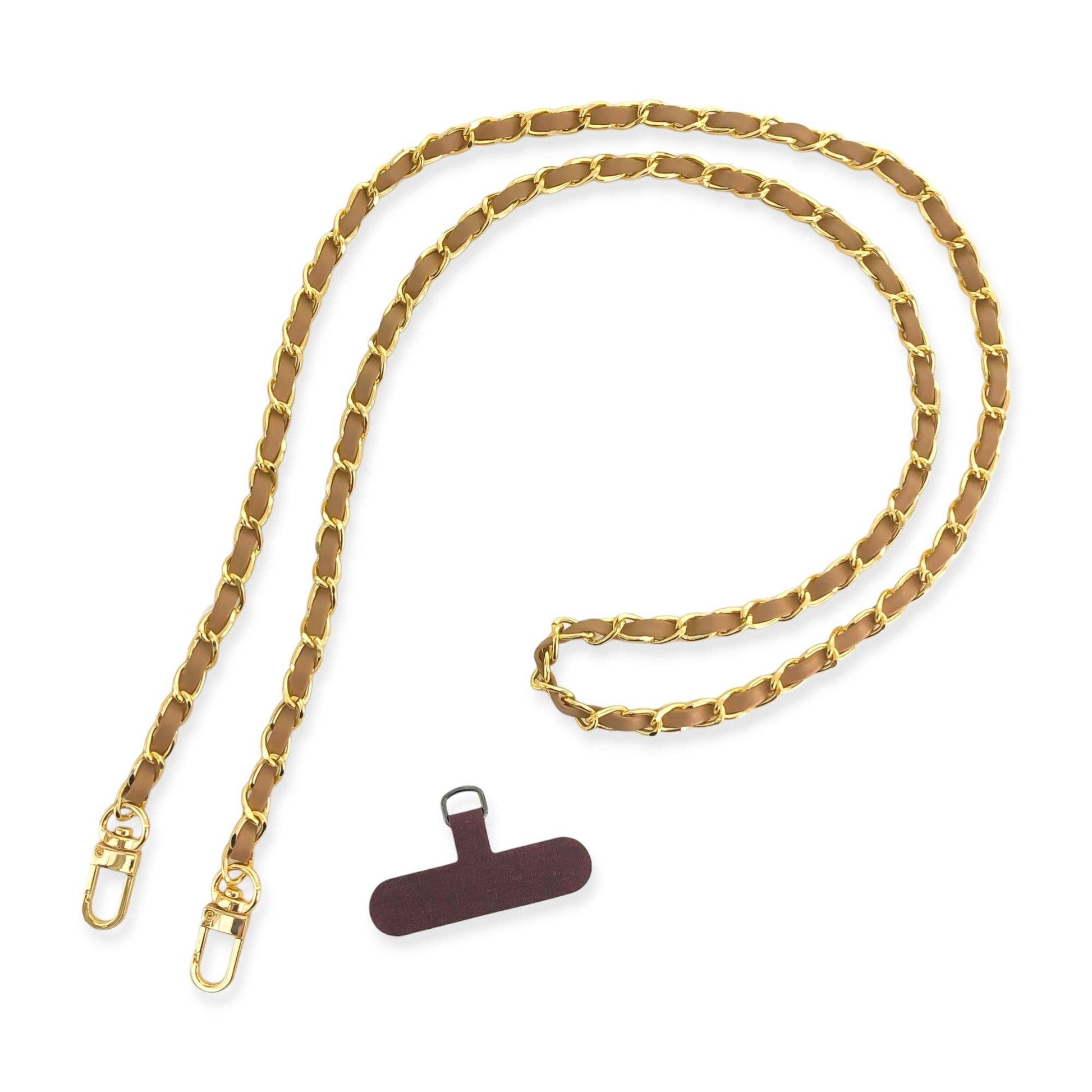 A stylish and lightweight plated aluminum curb chain cellphone strap with interwoven vegan leather secured by two clasps. The chain is long enough to use as a phone chain or purse chain for a fashionable and sophisticated look.