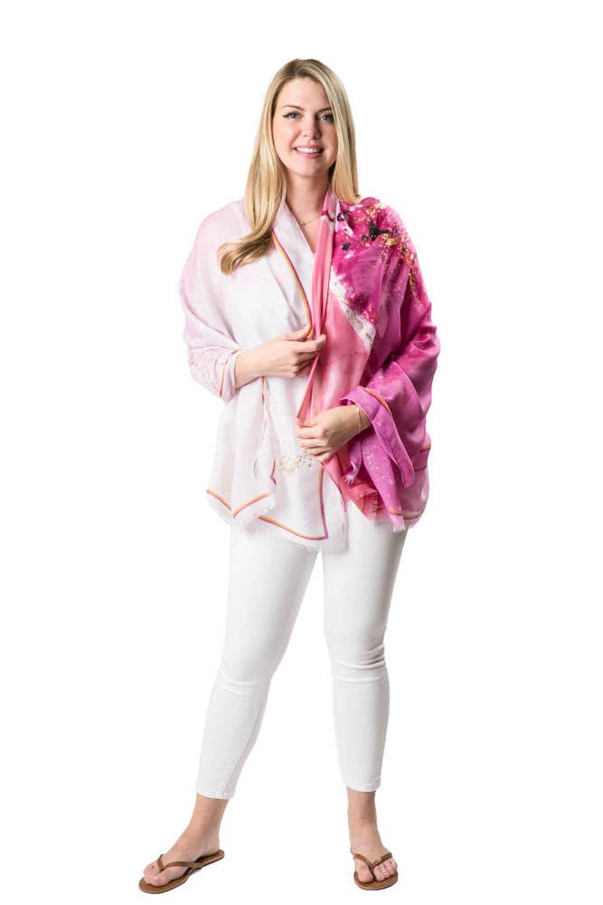 The Stephanie Scarf adds a pop of color and fun to any outfit. Bright colors, 'marble' print and eyelash fringe make this oblong scarf an everyday favorite. Wear it dressy or wear it casually over T-shirt & jeans!